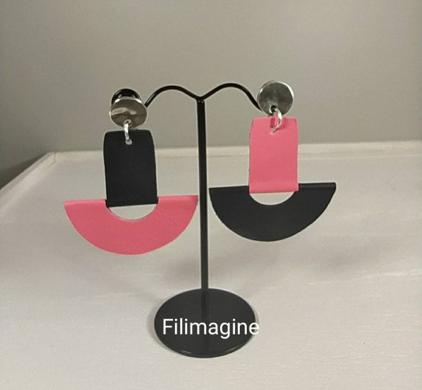 Boucles asymétriques cuir noir et rose, de la légèreté avant tout, le cuir est une matière noble et légère. Leur forme est très moderne et l’asymétrie est hyper tendance. Les deux couleurs noir et rose se marient à merveille et feront de vous une femme élégante et originale. Le motif en cuir a été découpé par mes soins avec une grande précision et monté sur une « puce » en métal plaqué argent.