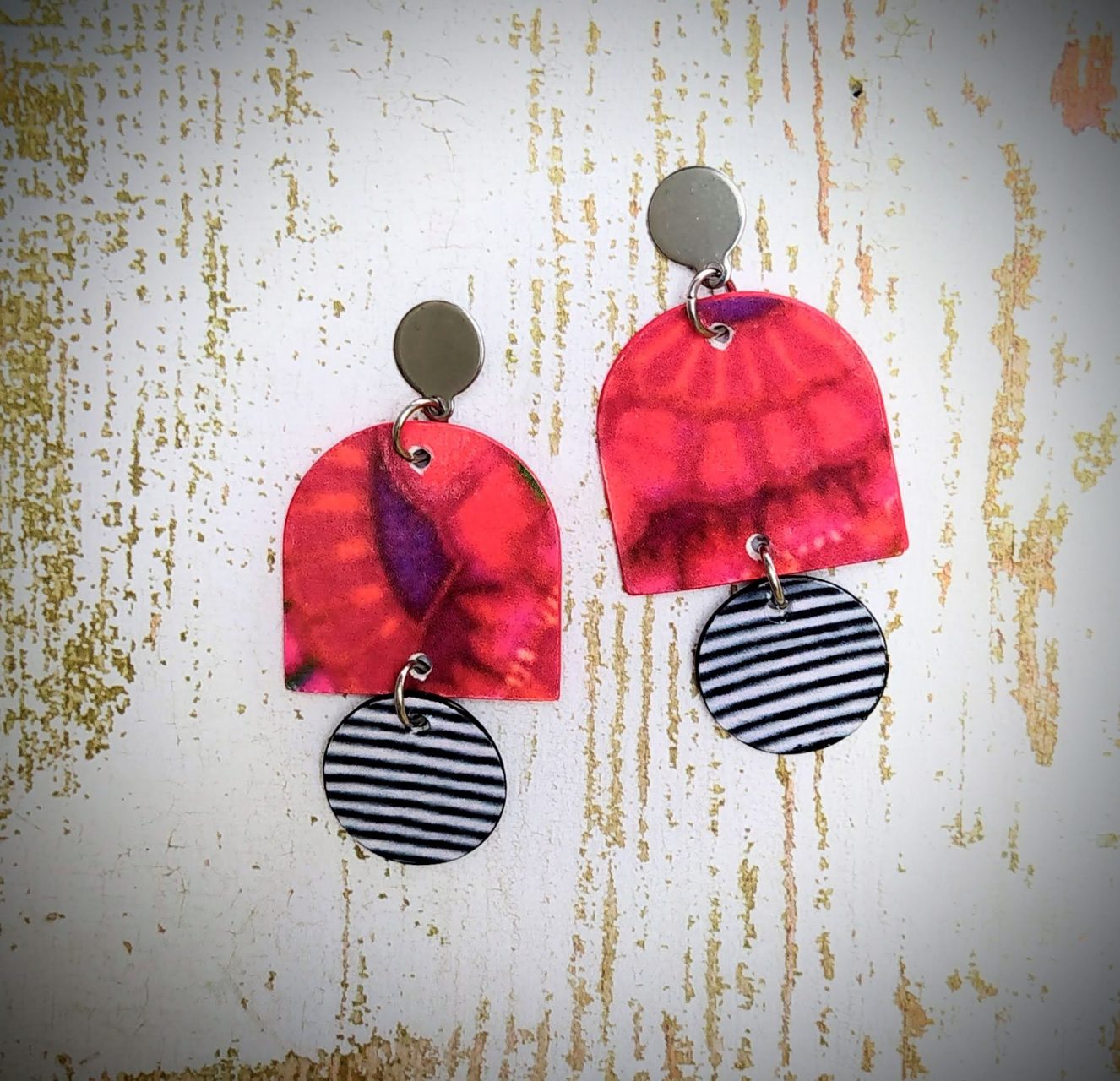 Boucles Berlin en papier glacé rouge et rayures de 6 cm de hauteur avec puce en acier inoxydable argenté.