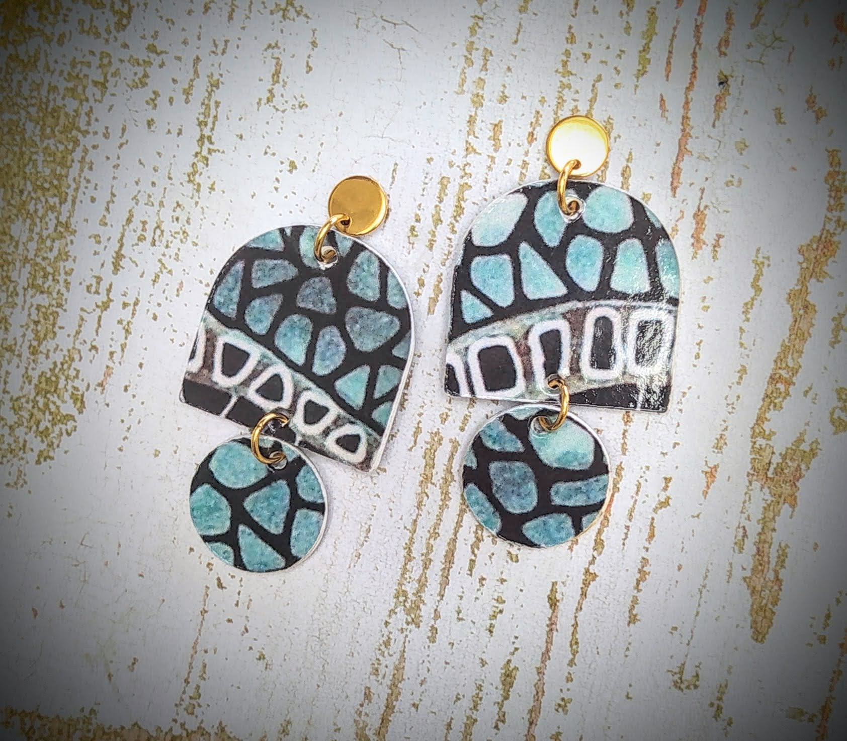 Boucles Berlin en papier glacé vert céladon et noir de 5,5 cm de hauteur avec puce en acier inoxydable doré.