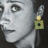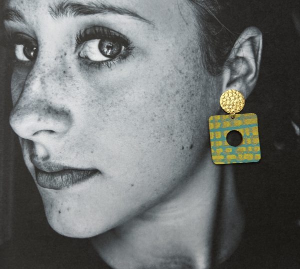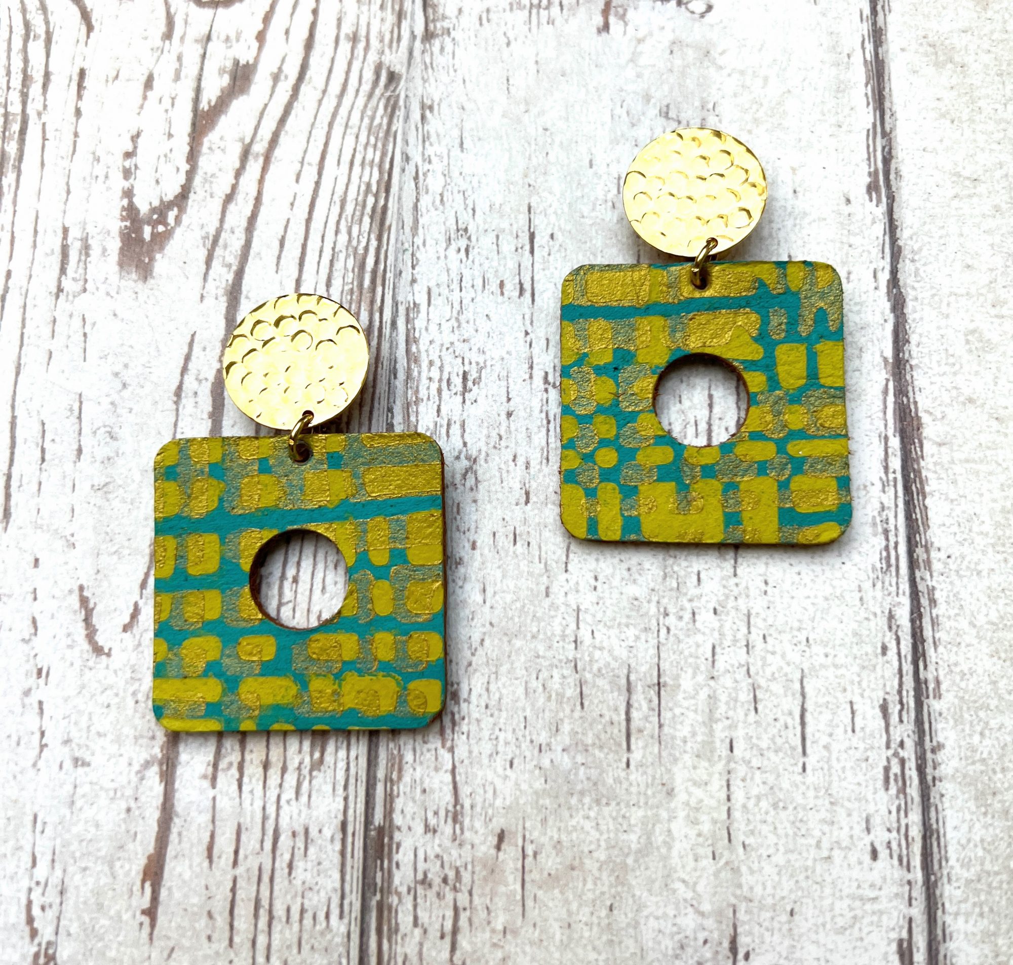 Boucles Clips Philadelphie cuir turquoise vert anis et doré peint à la main , carré de 35 mm , clip rond doré martelé de 18 mm de diamètre en laiton doré à l’or fin.