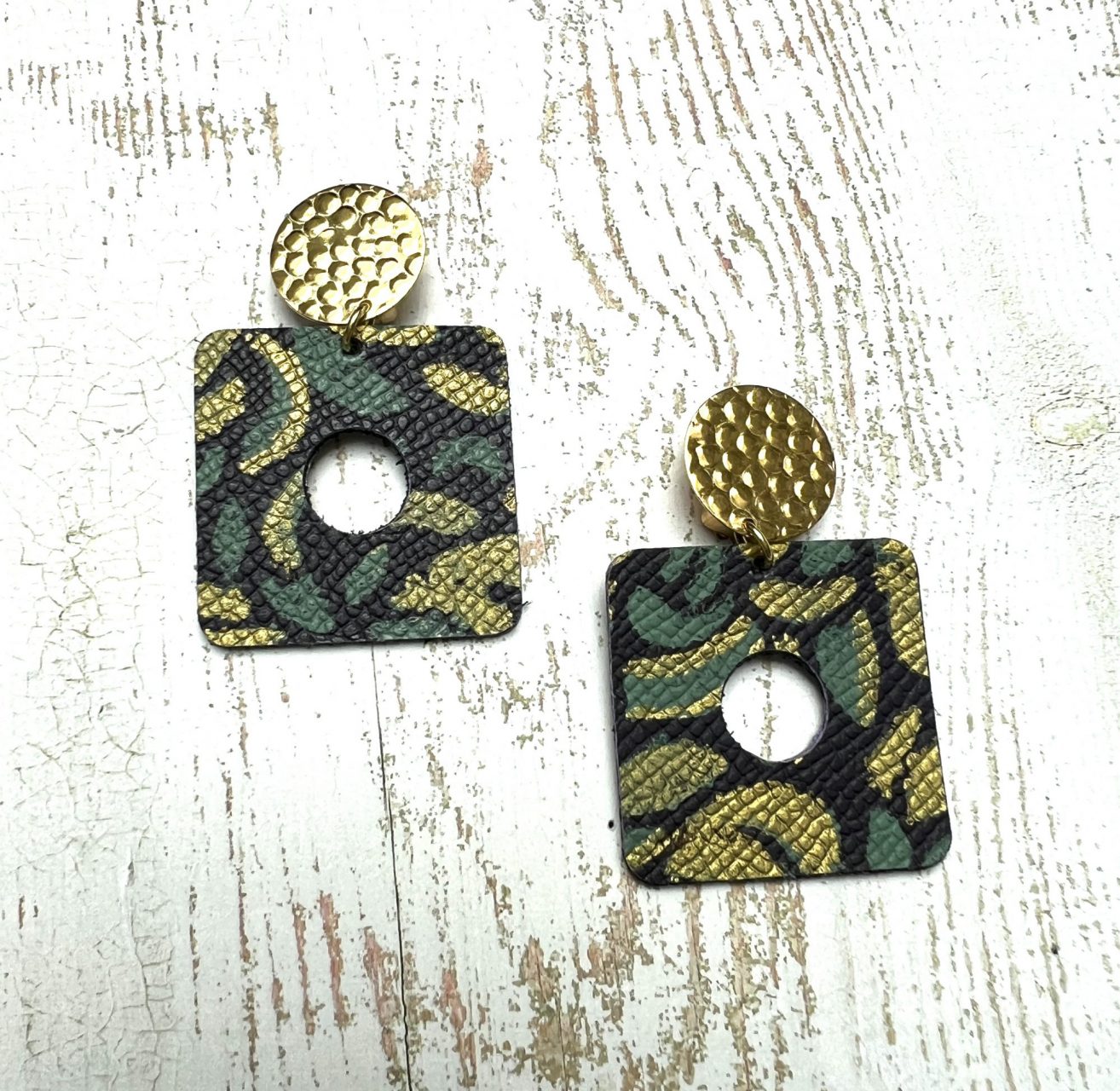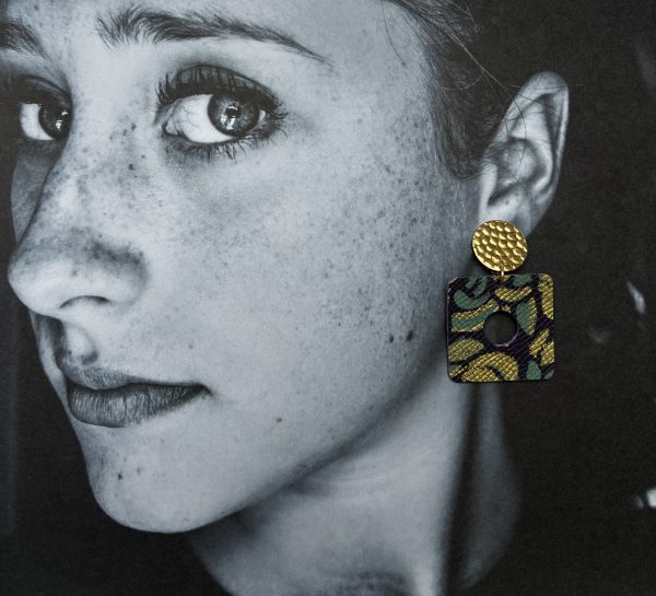 Boucles Clips Philadelphie cuir vert forêt et doré peint à la main , carré de 35 mm , clip rond doré martelé de 18 mm de diamètre en laiton doré à l’or fin.