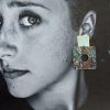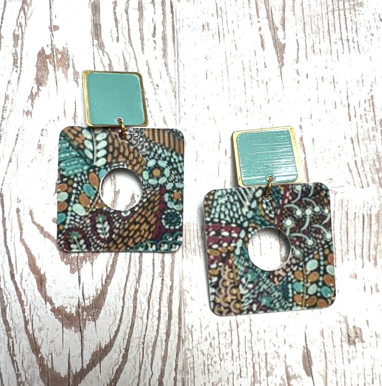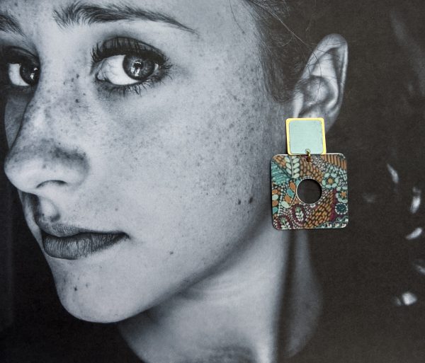 Boucles Clips Philadelphie en papier glacé camaïeu de bleu , carré de 40 mm , clip carré de 20 mm de côté en laiton doré à l’or fin.