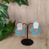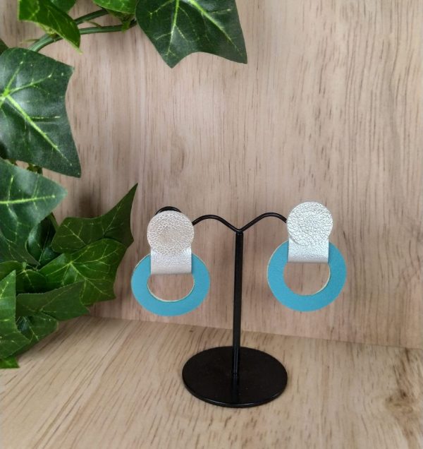 Boucles cuir réversible argenté, de la légèreté avant tout, le cuir est une matière noble et légère. Le cercle en cuir argenté est doublé d’un cuir bleu pastel, la boucle est donc réversible. Les motifs en cuir ont été découpés par mes soins avec une grande précision. Clou en acier inoxydable qui permet de retourner la boucle grâce à la lanière en cuir doré qui enserre le cercle.