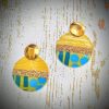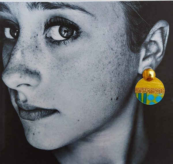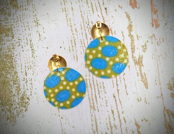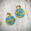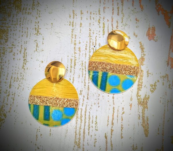 Boucles Denver en papier glacé bleu jaune et doré de 3,5 cm de diamètre et de 4 cm de hauteur avec puce en acier inoxydable doré.