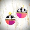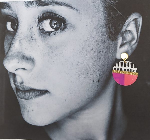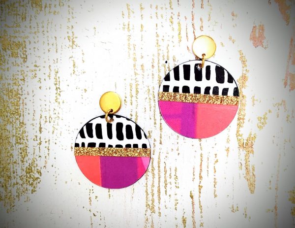 Boucles Denver en papier glacé fuchsia orange et noir de 3,5 cm de diamètre et de 4,5 cm de hauteur avec puce en acier inoxydable doré.
