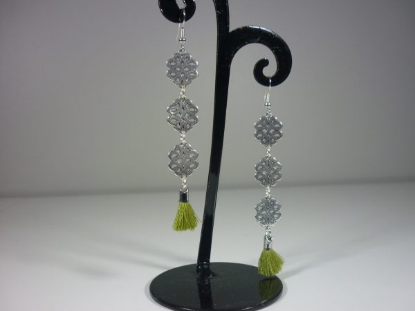 Boucles d’oreilles longues pompon vert, composées d’éléments filigranes en métal argenté de qualité supérieure et d’un petit pompon en textile vert anis. Chaque boucle pèse 3 gr, à la fois chic et légère, elle sera très agréable à porter et sublimera toutes vos tenues.