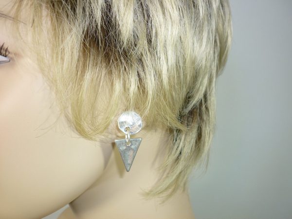 Boucles d’oreilles puces argentées avec une pampille triangle hyper originale : cette boucle est composée d’une médaille de 14 mm de diamètre montée sur « clou ». Elles sont intemporelles et iront avec toutes vos tenues. Très légères elles sont d’un confort inégalé. Ce bijou est livré dans une pochette toute douce fabrication Filimagine.