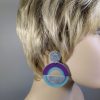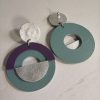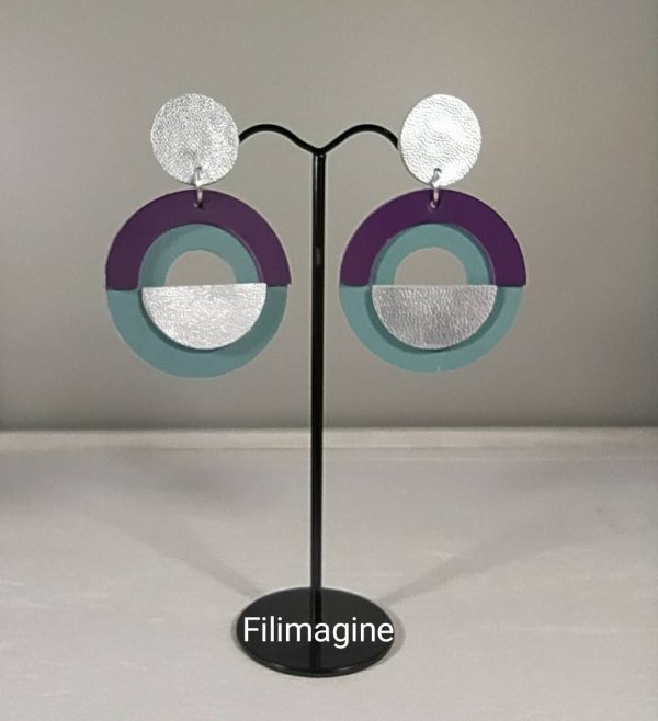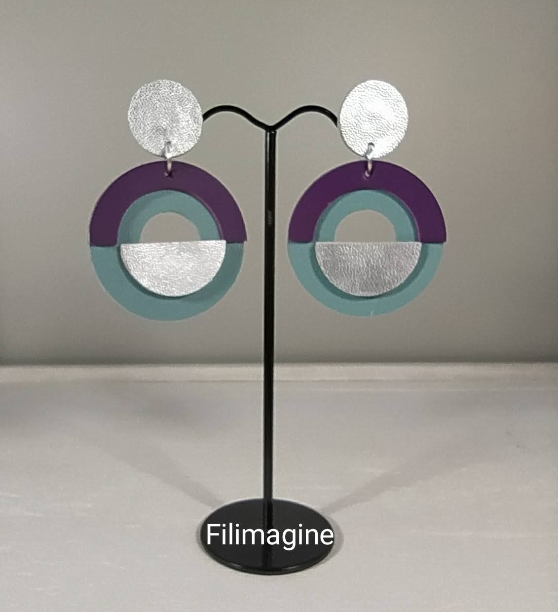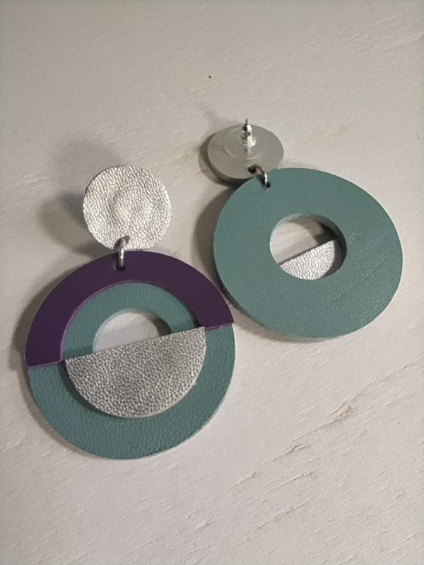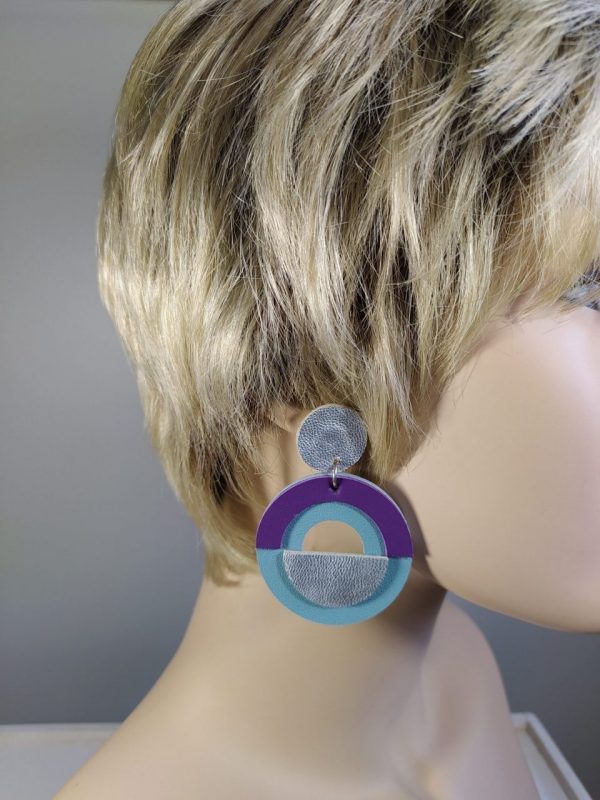 Boucles géométriques cuir bleu argent violet, de la légèreté avant tout, le cuir est une matière noble et légère. Leur forme est très moderne et hyper tendance. Les couleurs sont très originales et se marient à merveille. Les motifs en cuir ont été découpés par mes soins avec une grande précision. Accrochage par « clou » inséré dans les 2 épaisseurs de cuir.