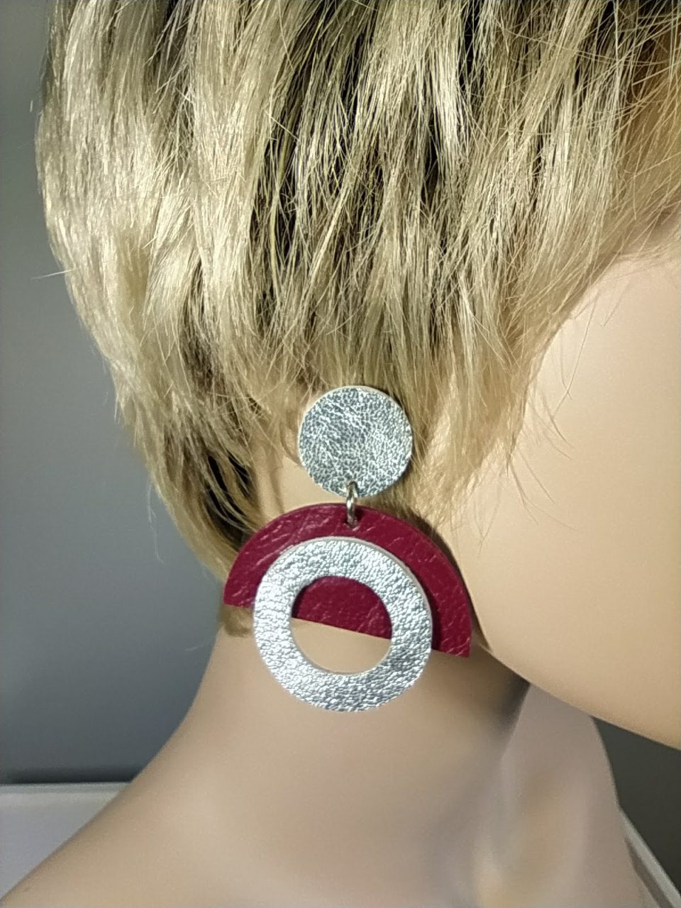Boucles géométriques cuir émeraude et violet, de la légèreté avant tout, le cuir est une matière noble et légère. Leur forme est très moderne et hyper tendance. Les couleurs se marient à merveille. Les motifs en cuir ont été découpés par mes soins avec une grande précision. Accrochage par « clou » inséré dans les 2 épaisseurs de cuir.