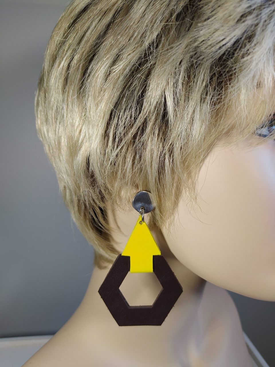 Boucles géométriques cuir marron et jaune, de la légèreté avant tout, le cuir est une matière noble et légère. Leur forme est très moderne et  hyper tendance.