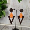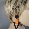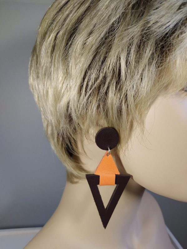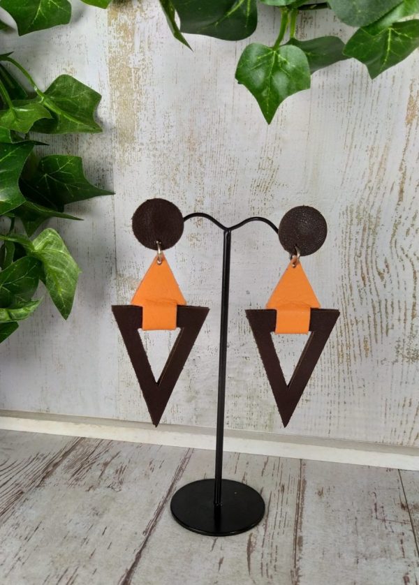 Boucles géométriques cuir marron et orange, de la légèreté avant tout, le cuir est une matière noble et légère. Leur forme est très moderne et hyper tendance. Les deux couleurs marron foncé et orange se marient à merveille et feront de vous une femme élégante et originale. Les motifs en cuir ont été découpés par mes soins avec une grande précision.