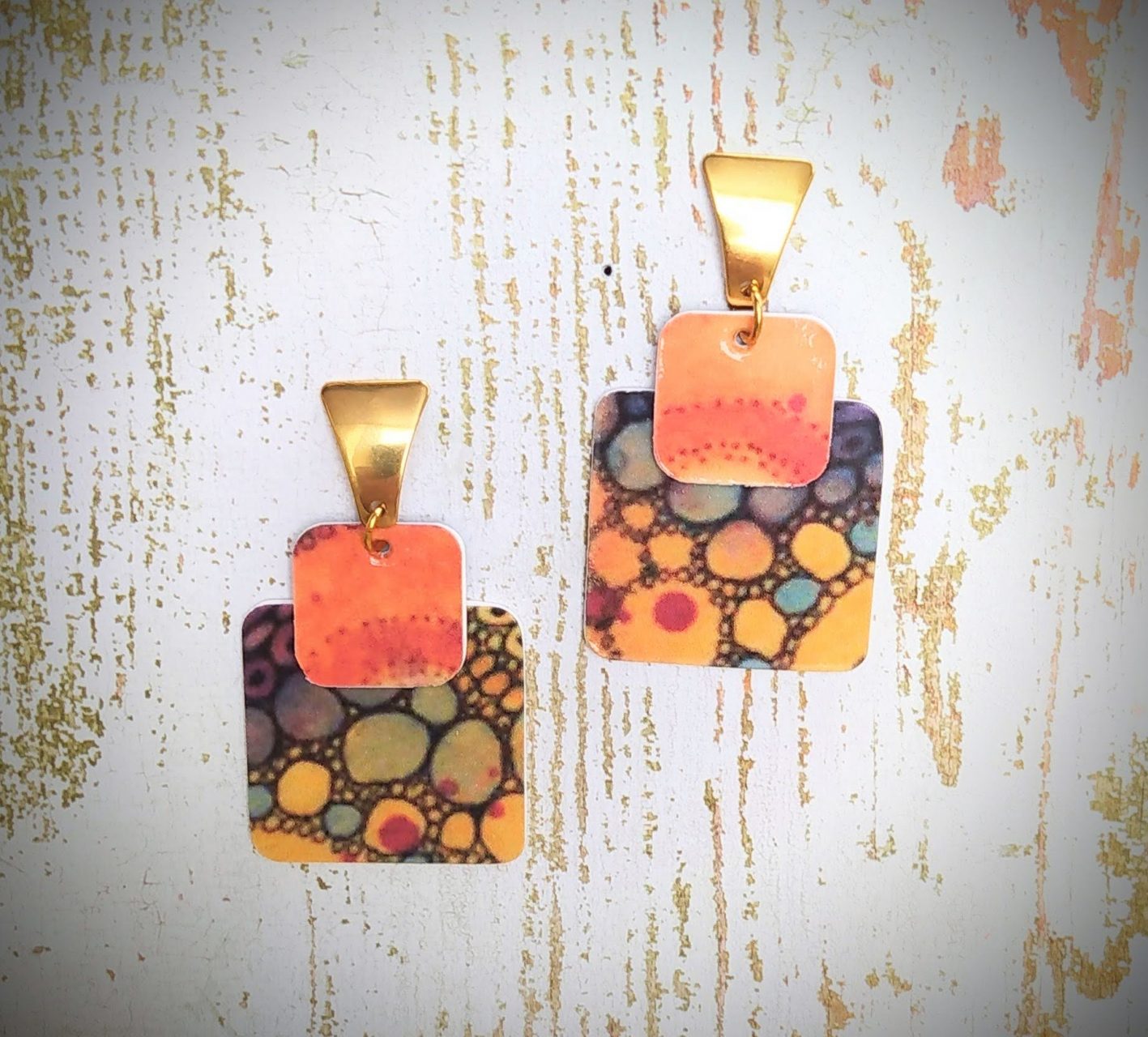 Boucles d’oreilles en papier glacé de 5,5 cm de hauteur totale. Très légères elles sont d’un confort inégalé. Les couleurs sont lumineuses et éclaireront toutes vos tenues.  Formes découpées avec précision par mes soins, mais les motifs peuvent être légèrement différents selon le placement de ma découpe. Cette particularité leur donne toute leur originalité.