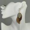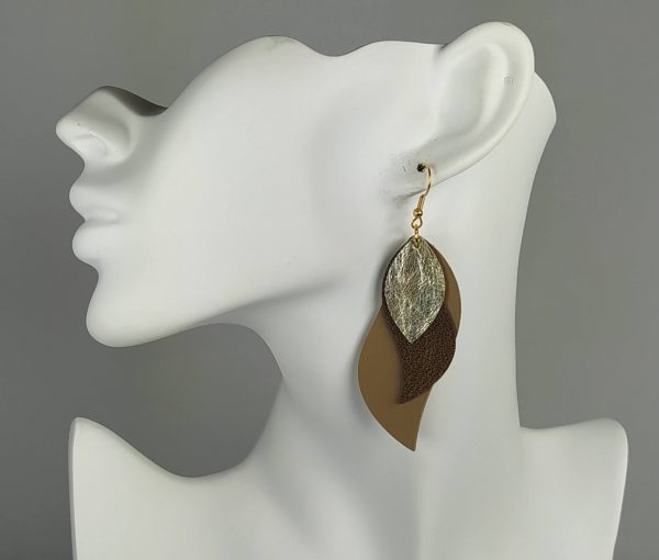 Boucles longues cuir beige marron et doré de 8 cm de hauteur avec crochet en acier inoxydable.