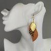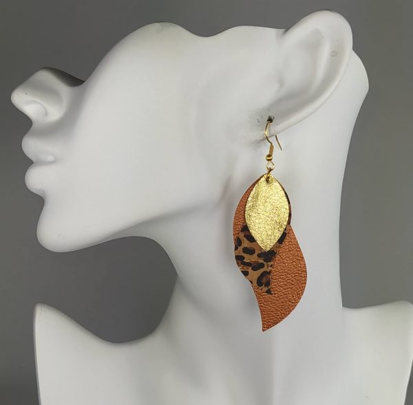Boucles longues cuir camel léopard et doré de 8 cm de hauteur avec crochet en acier inoxydable.
