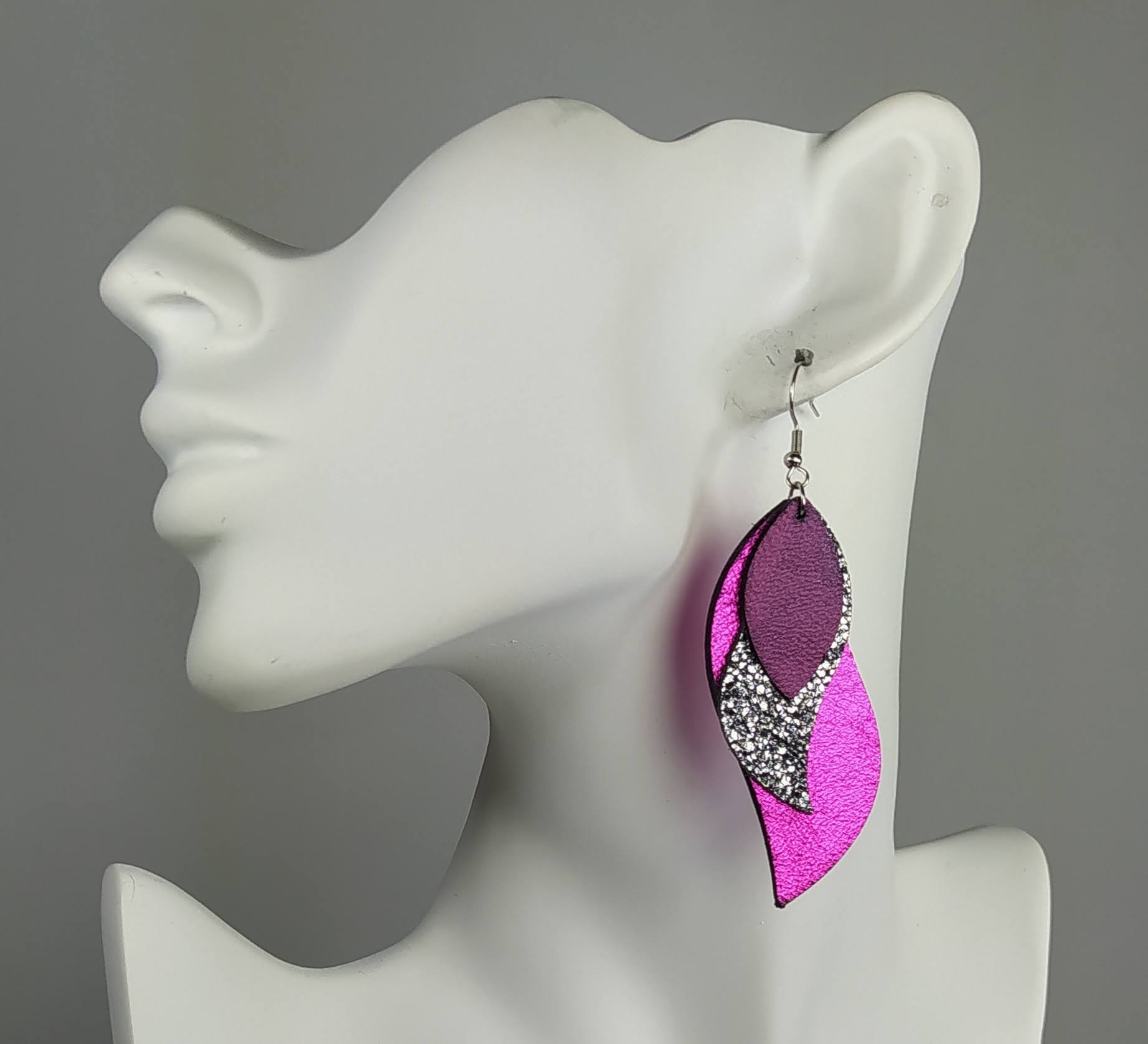 Boucles longues cuir métallisé rose argent et violet de 8 cm de hauteur avec crochet en acier inoxydable.