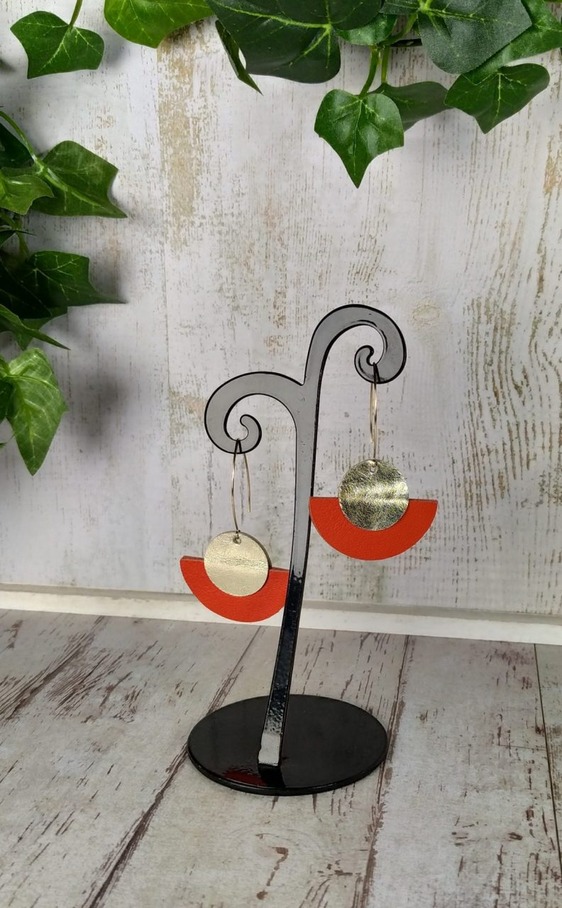 Boucles longues cuir orange et or, de la légèreté avant tout, le cuir est une matière noble et légère. Leur forme géométrique est très moderne. Les motifs en cuir sont découpés par mes soins avec une grande précision, le cuir est doublé cuir sur cuir, par conséquent votre boucle d’oreille est aussi belle au recto qu’au verso. Elles sont montées sur un crochet de 3,2 cm en Gold filled. Voici ce qu’est le Gold filled :