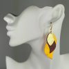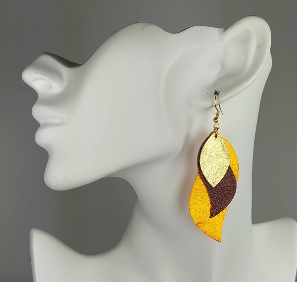 Boucles longues cuir orange marron et doré de 8 cm de hauteur avec crochet en acier inoxydable.