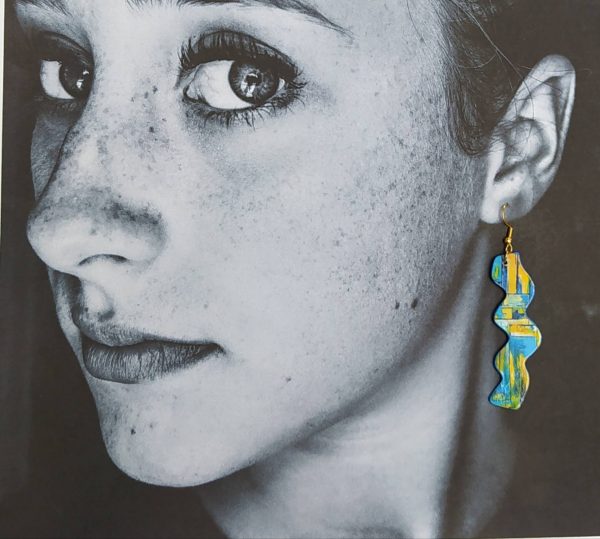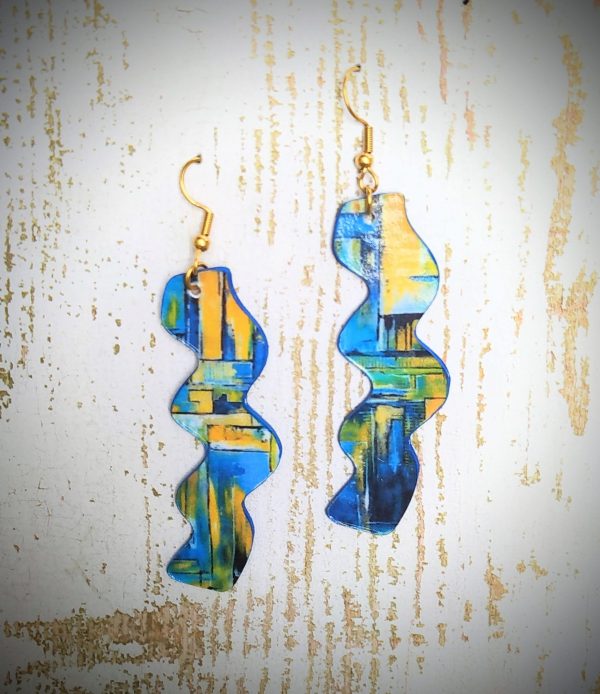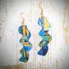 Boucles Palerme en papier glacé bleu et jaune de 7,5 cm de hauteur avec crochet doré en acier inoxydable.