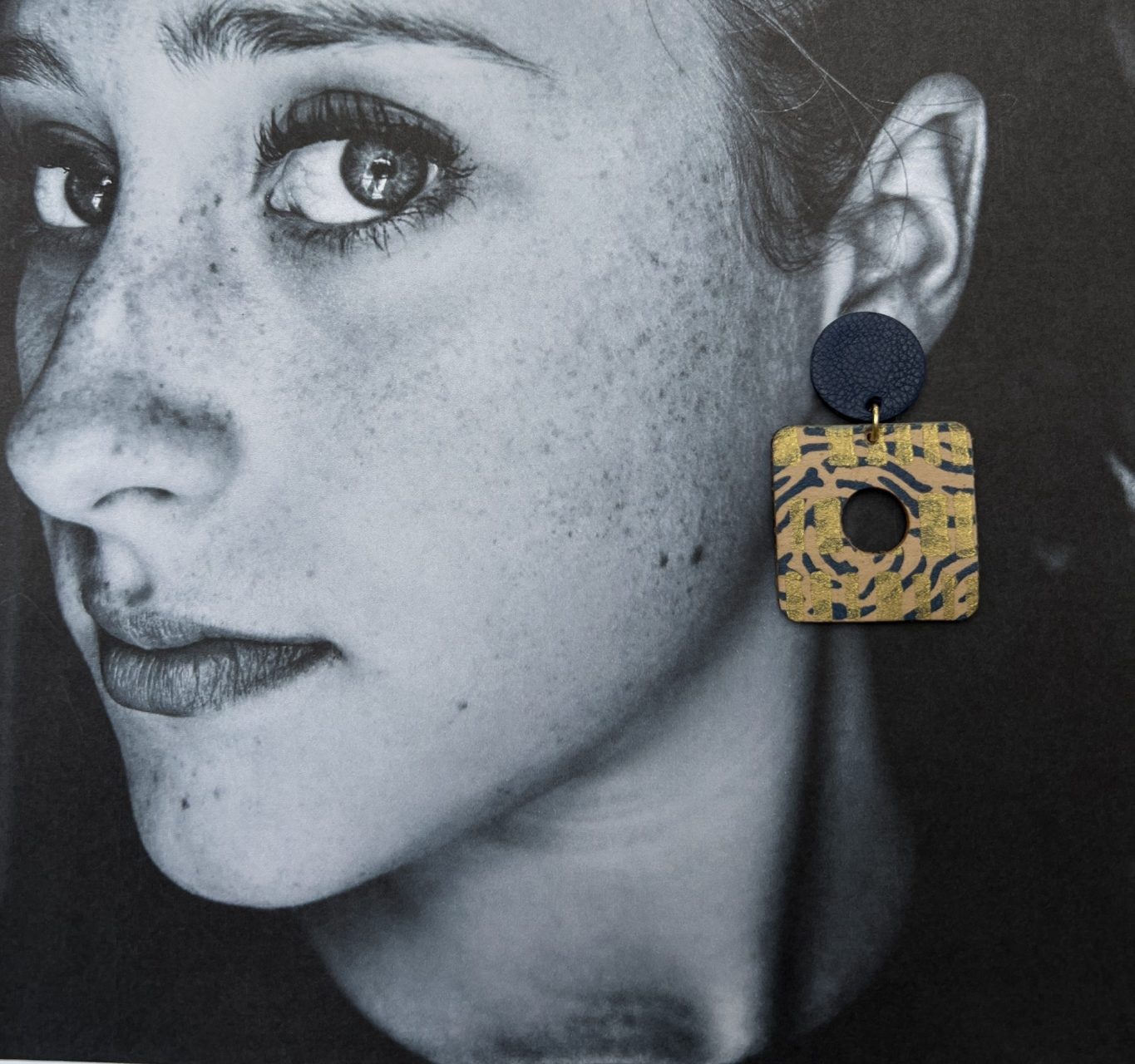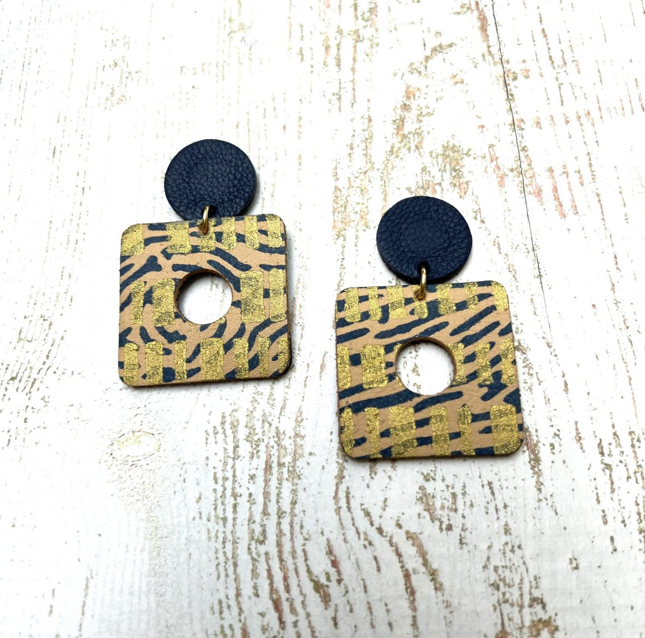 Boucles Philadelphie cuir marine et or sur fond beige peint à la main, carré de 35 mm , puce ronde en cuir marine de 22 mm de diamètre. Le clou est en acier inoxydable.