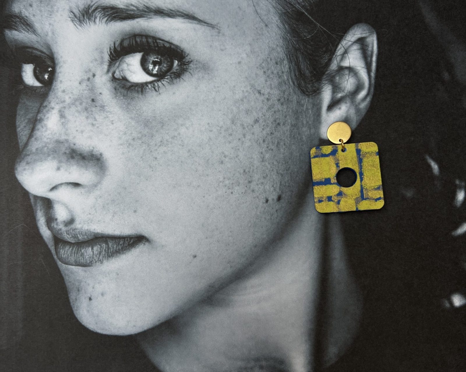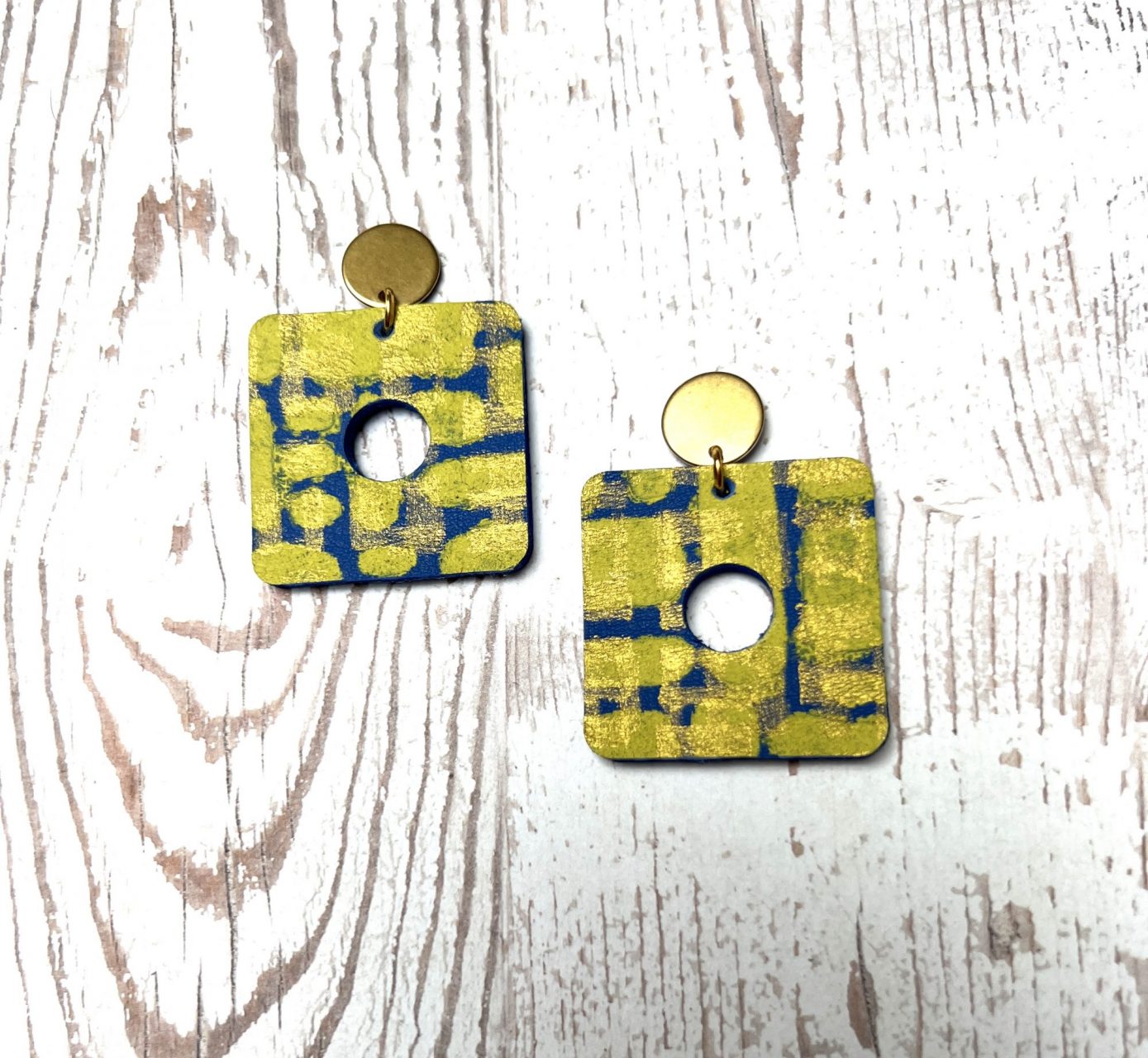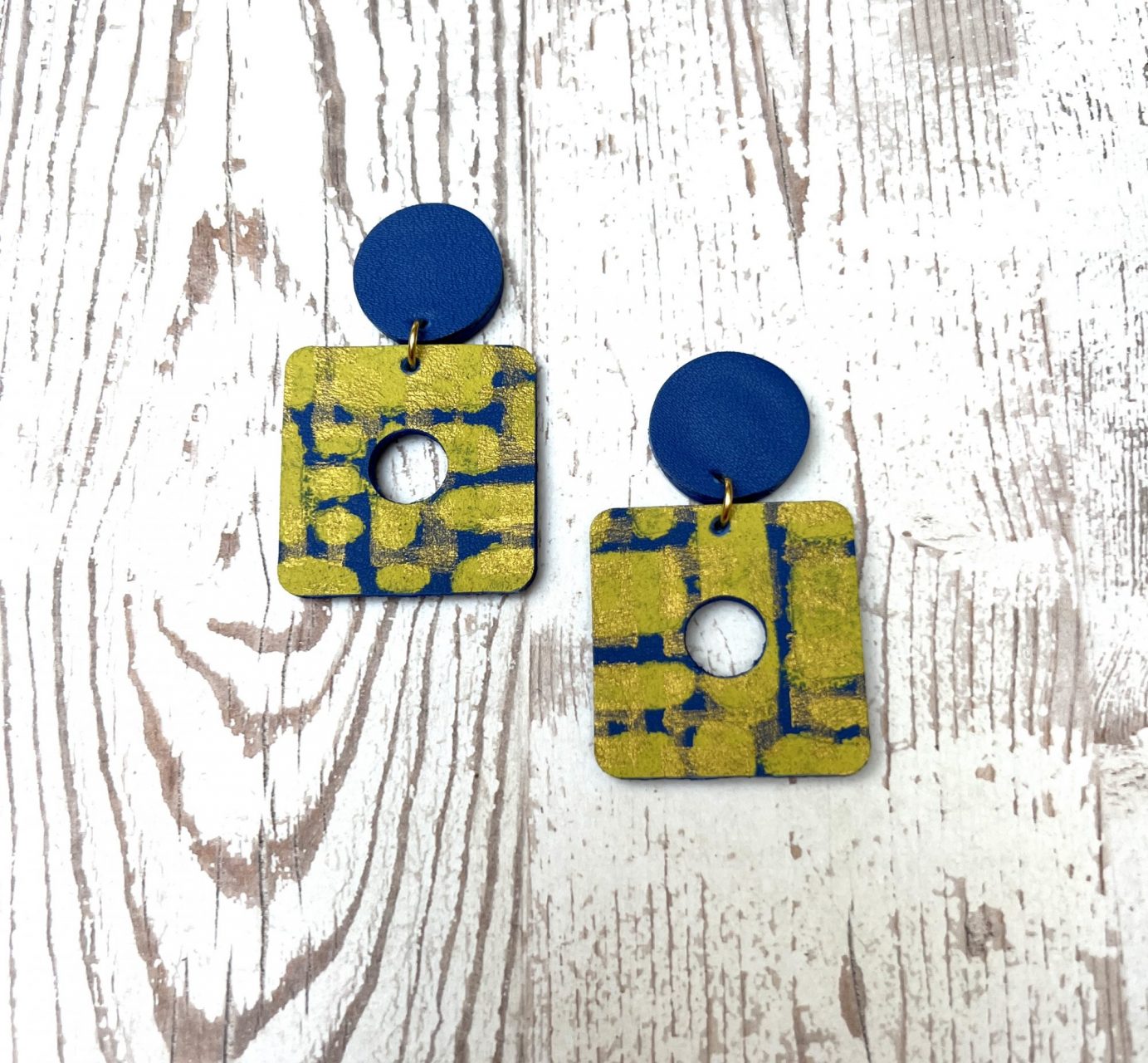 Boucles Philadelphie cuir peint à la main vert anis et doré, carré de 33 mm , puce ronde de 12 mm de diamètre en acier inoxydable ou au choix, puce en cuir bleu de 20 mm de diamètre.