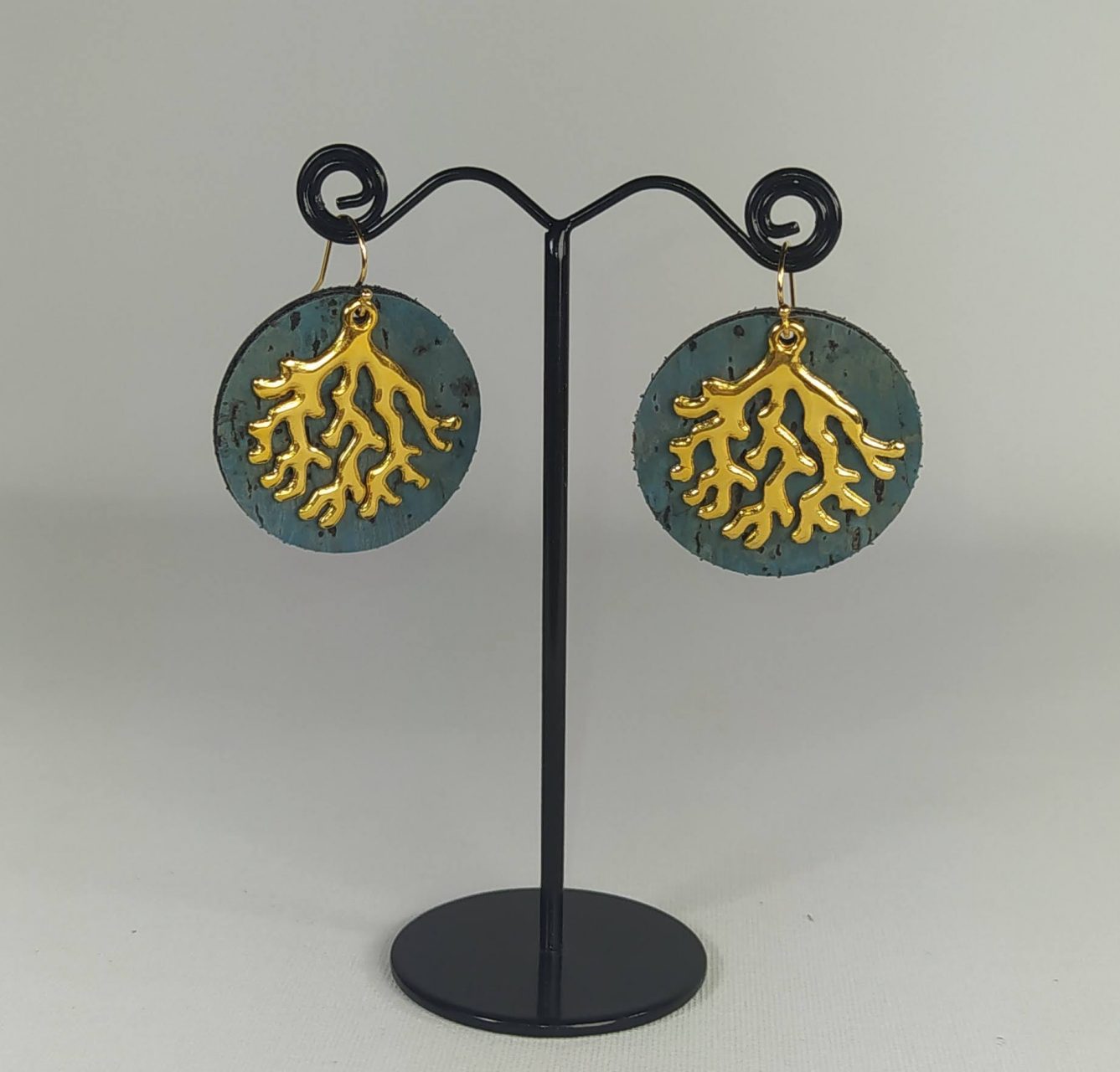 Ces boucles sont en liège recto et verso, agrémentées d’un motif « corail » en zamac doré à l’or fin.