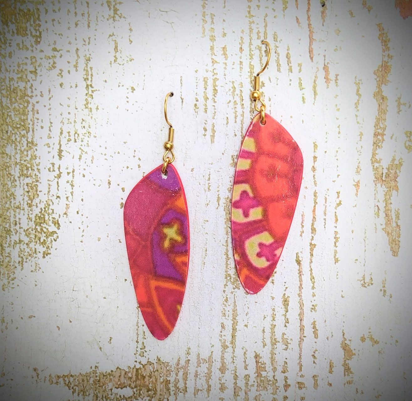 Boucles Stockholm en papier glacé dominante rouge de 7 cm de hauteur avec crochet doré en acier inoxydable.