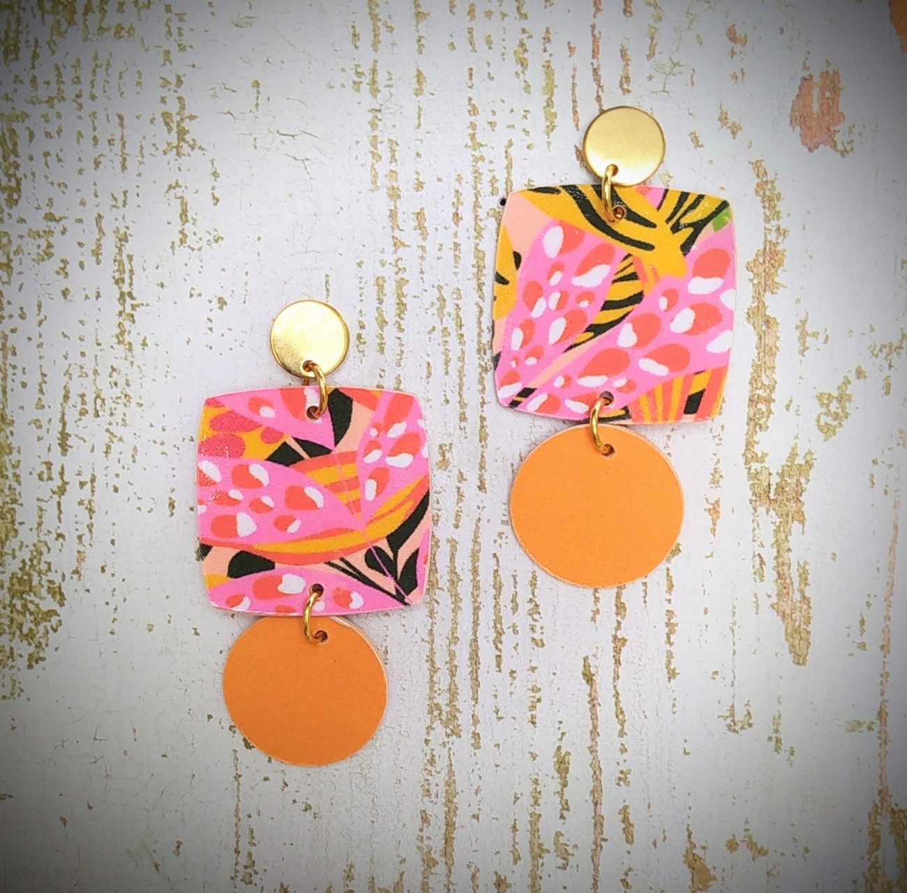 Boucles Tokyo en papier glacé abricot et rose de 6 cm de hauteur avec puce en acier inoxydable doré.