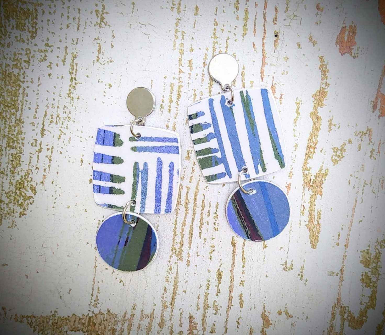 Boucles Tokyo en papier glacé bleu et blanc de 6 cm de hauteur avec puce en acier inoxydable.