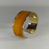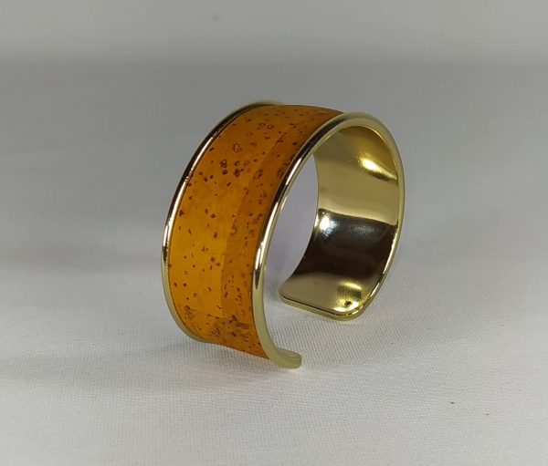 Ce bracelet se compose d’une lanière de liège curry montée sur un support en laiton doré. Le bracelet jonc a un écart de 3 cm (pas plus) et mesure 17 cm, soit un total de 20 cm qui conviendra à des poignets allant de 16 cm à 19 cm.