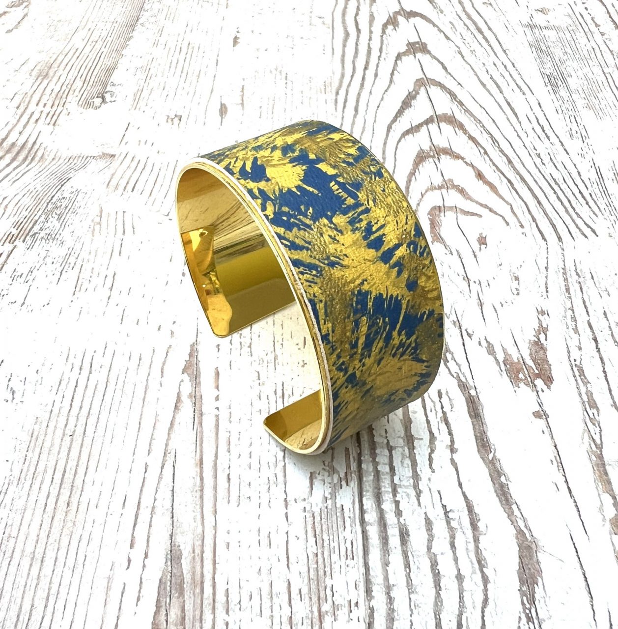 Ce bracelet se compose d’une lanière de cuir peint à la main jaune et or sur fond bleu montée sur un support en laiton doré à l’or fin. Le bracelet manchette a un écart de 3 cm (pas plus) et mesure 17 cm, soit un total de 20 cm qui conviendra à des poignets allant de 16 cm à 19 cm.