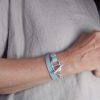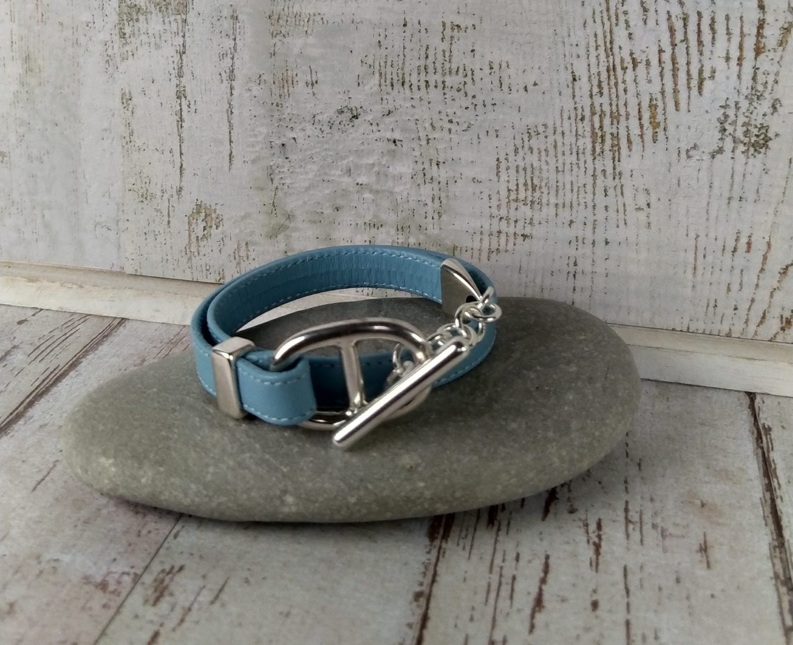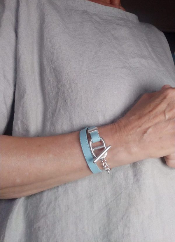 Bracelet cuir bleu pastel maille marine , travaillé en double tour et fermé par une magnifique maille marine et barre en métal plaqué argent.