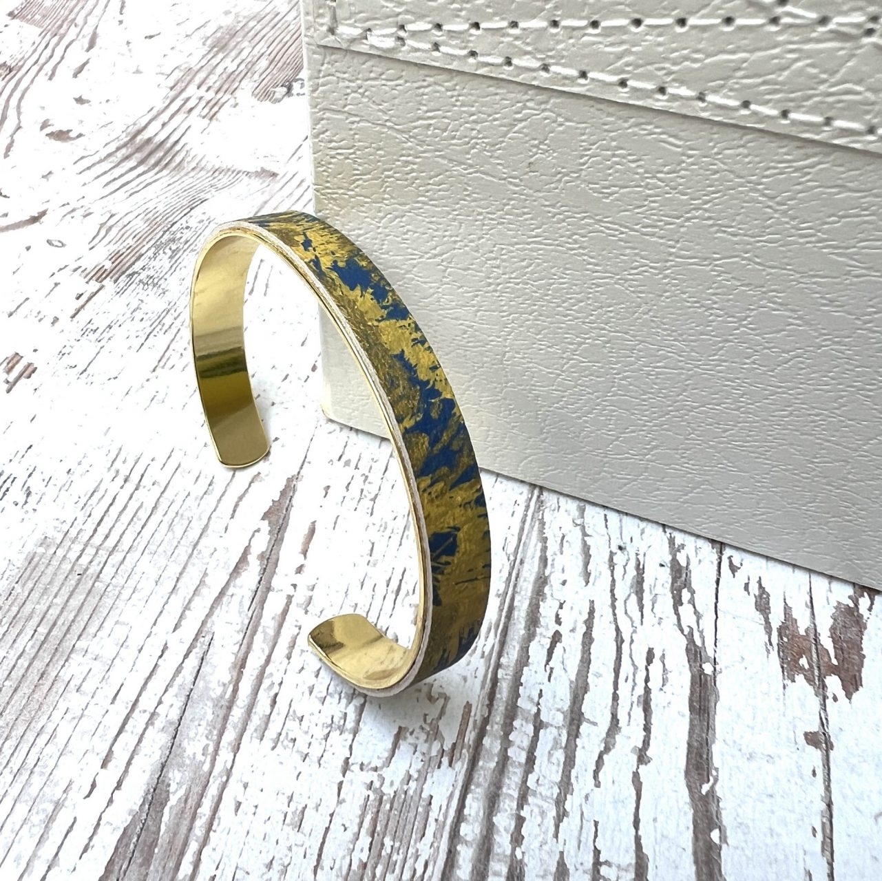 Bracelet fin en cuir peint à la main bleu et or. D’une grande finesse, il peut se porter seul ou avec d’autres bracelets pour être hyper tendance.