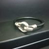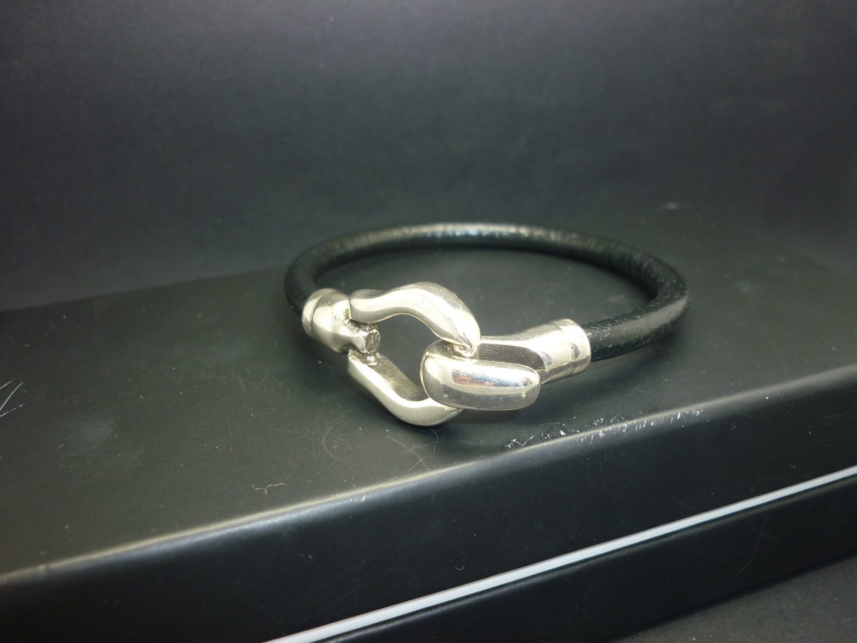 Bracelet homme cuir noir crochet en métal argenté de qualité supérieure, cordon en cuir rigide de 5 mm de diamètre. Les apprêts sont européens et garantis sans plomb, sans nickel et sans cadmium par mon fournisseur.