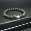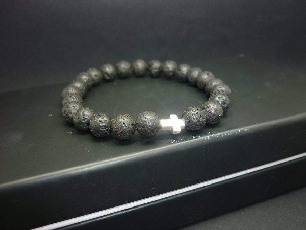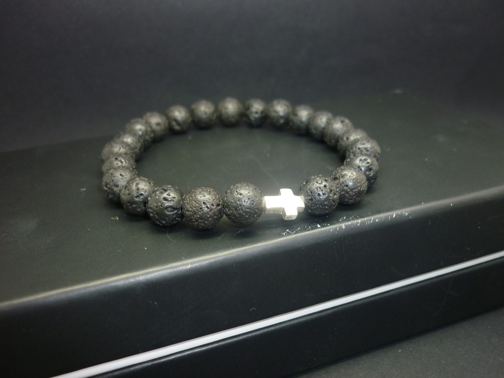 Bracelet homme perles de lave croix argent, monté sur un élastique spécial pour bracelet, très solide. La petite croix est en argent massif. Les perles font 8 mm de diamètre.