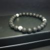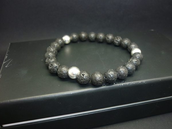 Bracelet homme perles de lave et argent massif, monté sur un élastique spécial pour bracelet, très solide. Les 3 petites perles sont en argent massif. Les perles font 8 mm de diamètre.