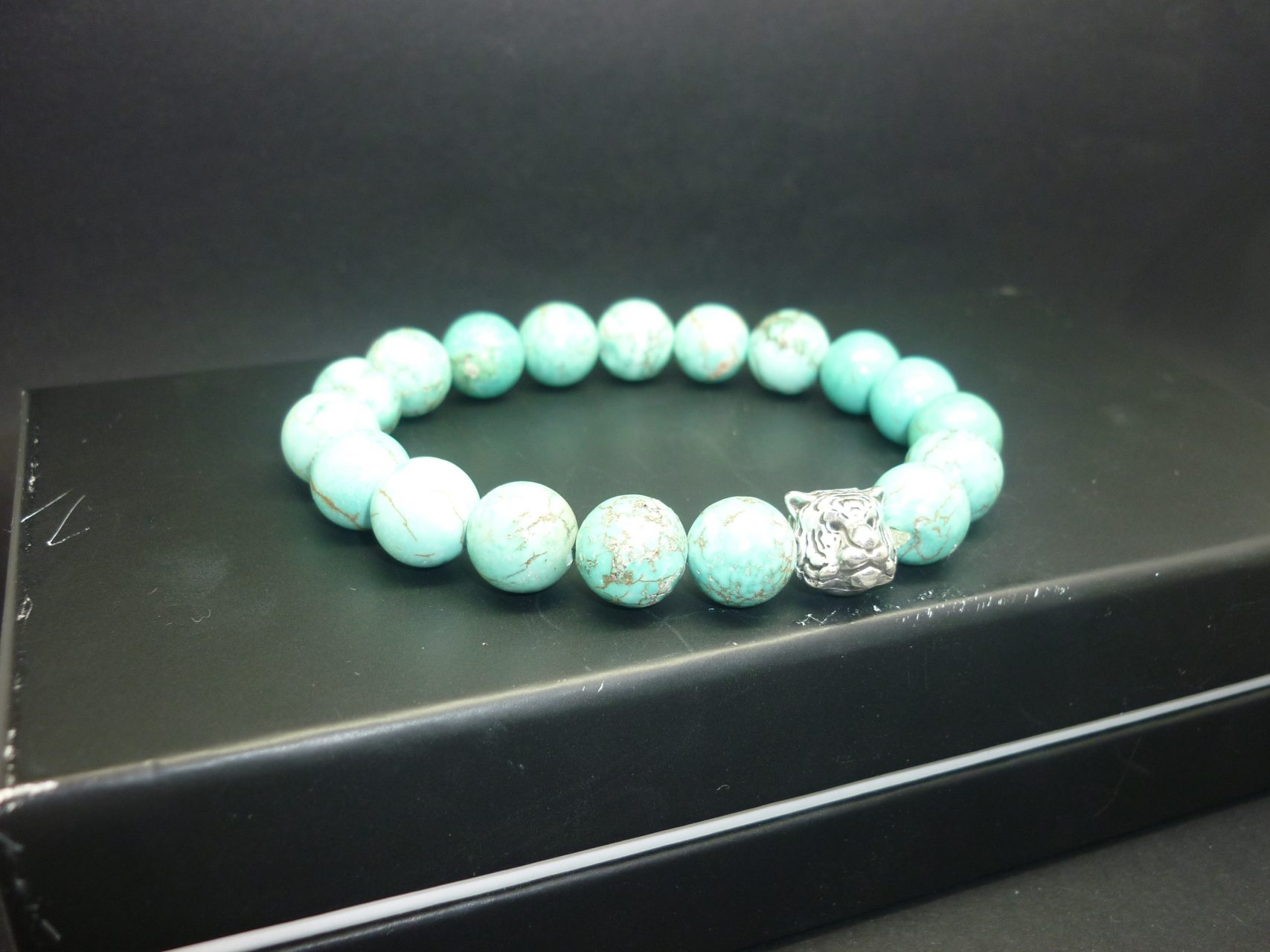 Bracelet homme perles turquoise tête tigre, monté sur un élastique spécial pour bracelet, très solide. Le passant en forme de tête de tigre est en métal argenté de qualité supérieure. Les perles font 10 mm de diamètre.