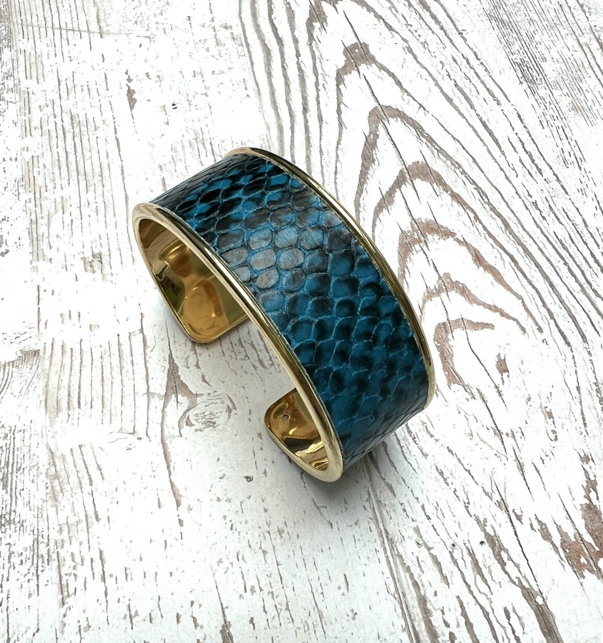 Ce bracelet se compose d’une lanière de cuir bleu texturé serpent montée sur un support en laiton doré à l’or fin. Le bracelet manchette a un écart de 3 cm (pas plus) et mesure 17 cm, soit un total de 20 cm qui conviendra à des poignets allant de 16 cm à 19 cm.