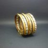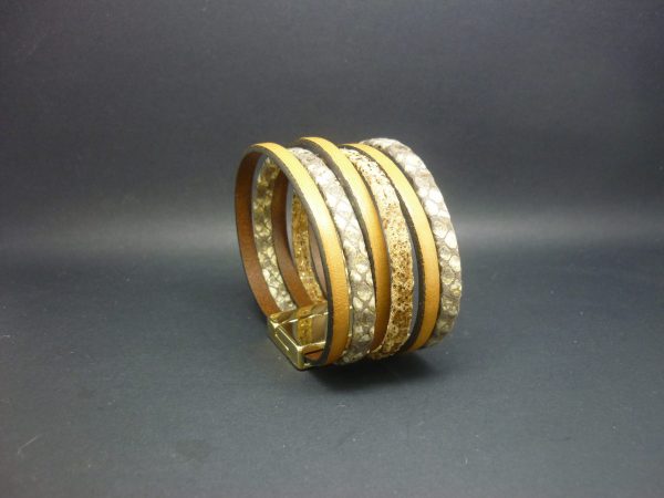 Bracelet multi cuir camel et doré composé de 6 lanières de cuir de 0,5 cm. Deux lanières de cuir texturé doré et taupe, une lanière centrale en cuir camel avec des paillettes dorées, et enfin trois lanières camel en cuir lisse. La largeur du bracelet est de 3 cm.
