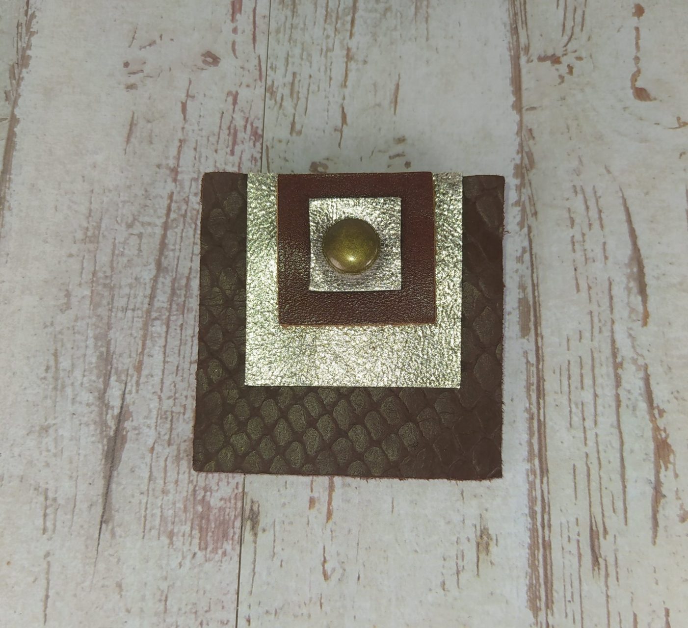 Broche cuir carré marron et doré, rivet assorti. Le cuir est une matière noble et légère, vous pourrez porter ce bijou en toute circonstance.