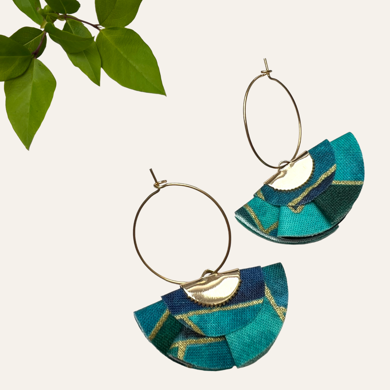 Créole dorée tissu éventail bleu turquoise de 25 mm de diamètre en acier inoxydable.