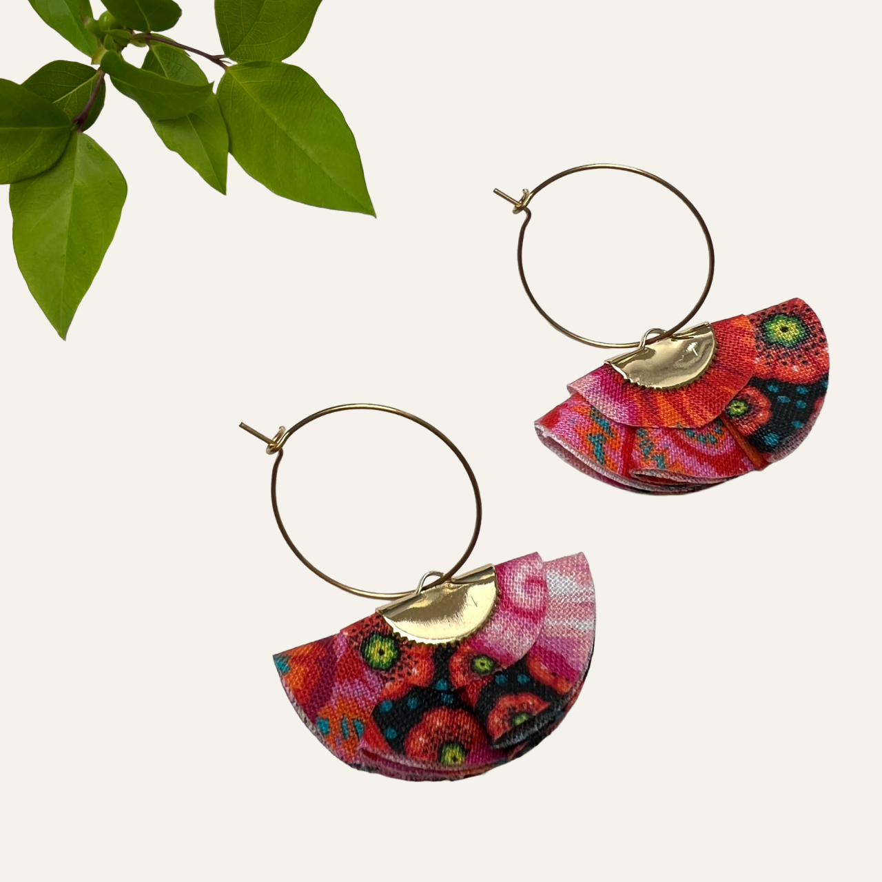 Le pendentif en forme d’éventail est créé avec des chutes de tissu utilisé pour la création de mes éventails.
