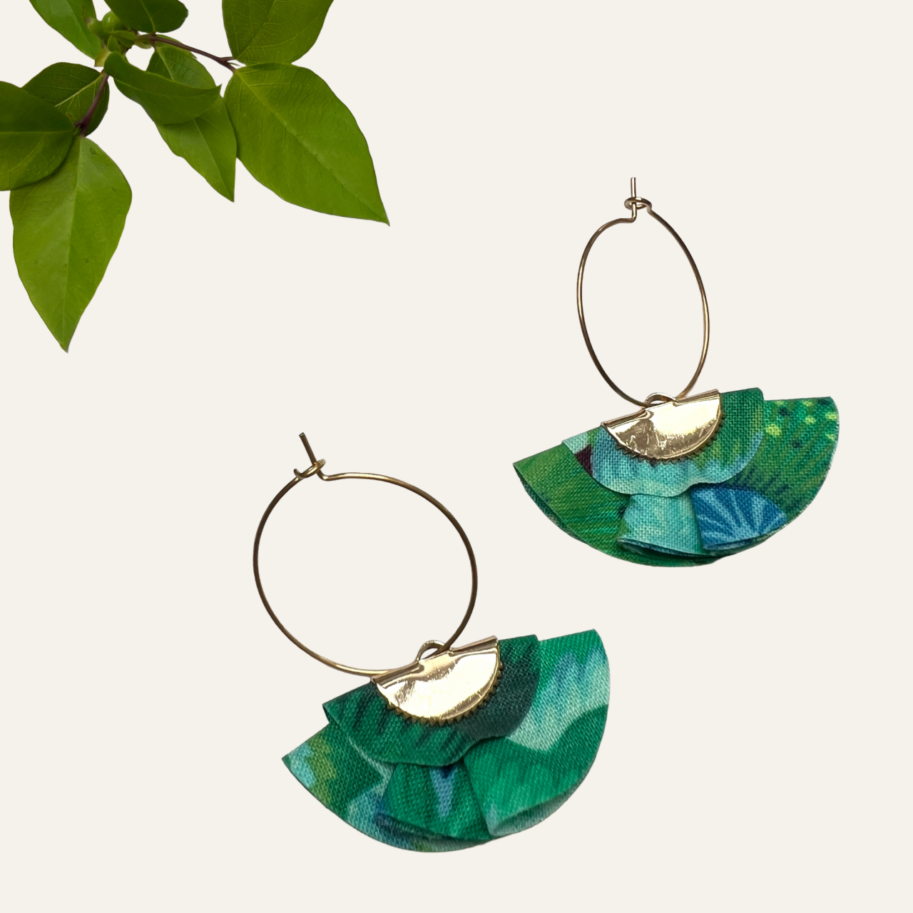 Créole dorée tissu éventail vert de 25 mm de diamètre en acier inoxydable.