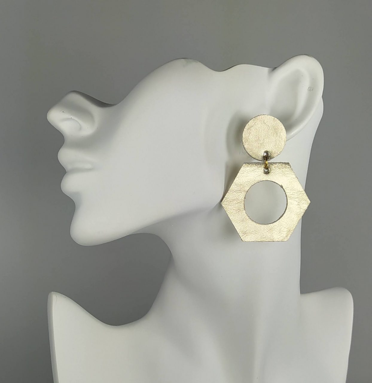 Boucles Créoles hexagonales en cuir doré de 4 cm de diamètre avec clous en acier inoxydable.