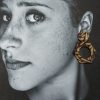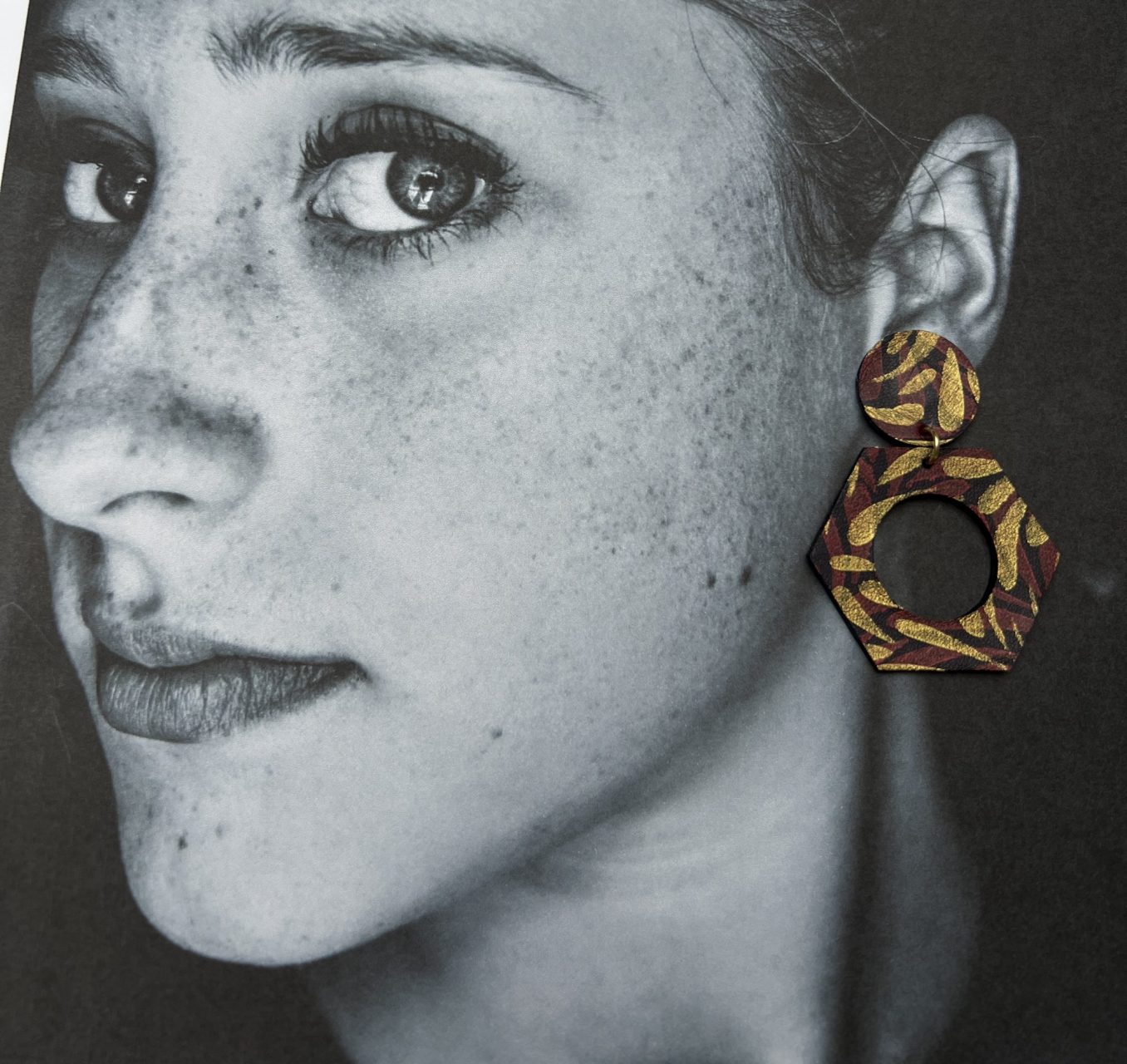 Boucles Créoles hexagonales Toronto en cuir bordeaux et or de 4 cm de diamètre avec clous en acier inoxydable.
