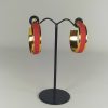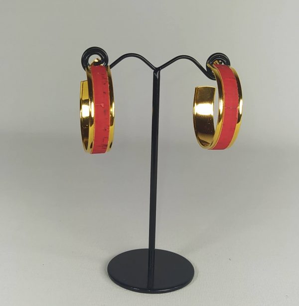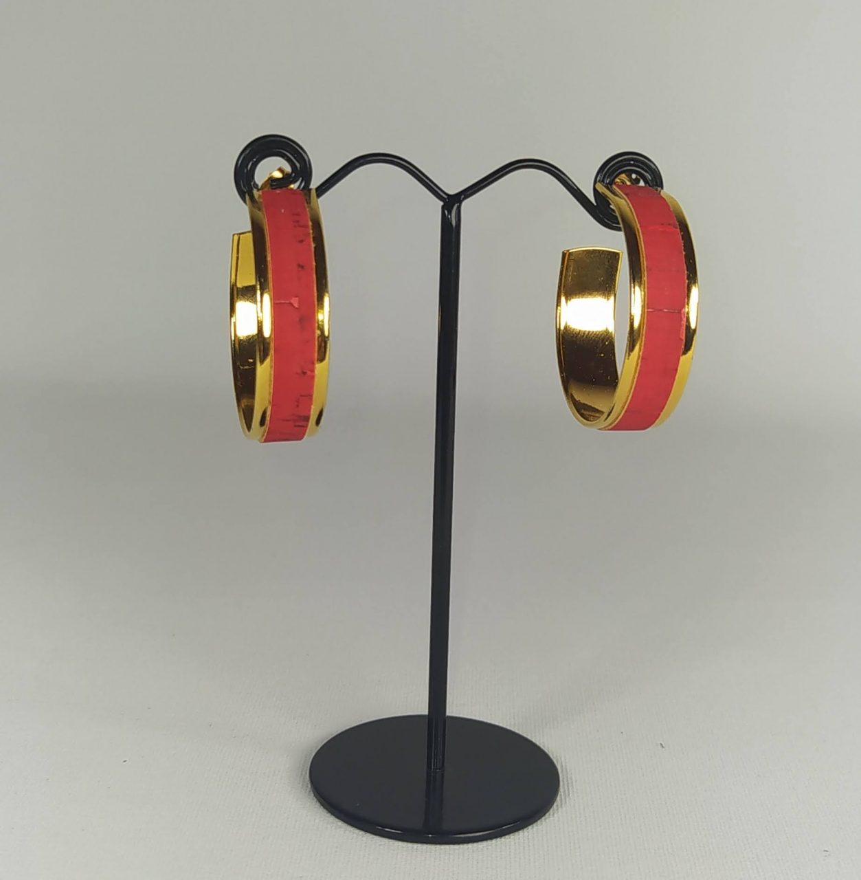 Créoles laiton doré et liège rouge de 35 mm de diamètre avec clou et poussoir doré.