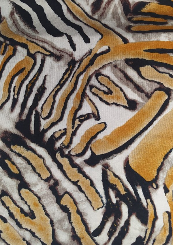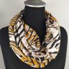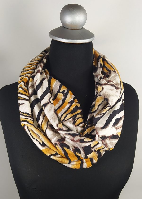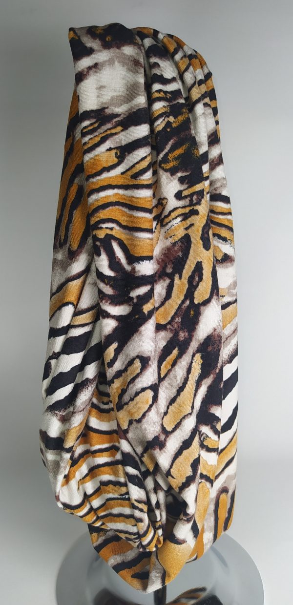 Echarpe snood tigrée en jersey fluide pour réchauffer votre cou. Vous ne craindrez plus que le vent vous l’emporte car elle est de forme circulaire.