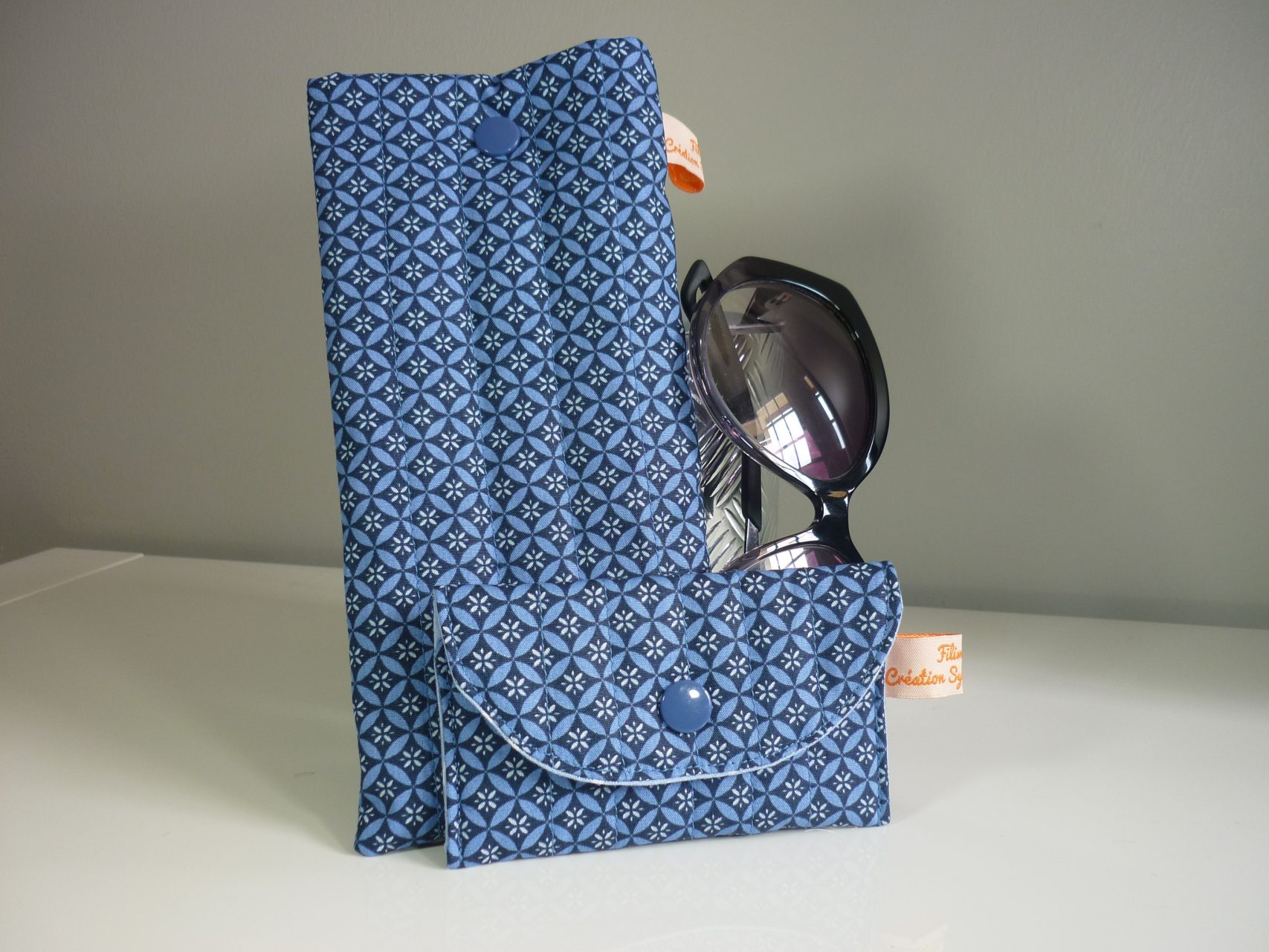 Etui à lunette et porte-cartes bleu duo en coton matelassé seront les accessoires parfaits pour cet été. Hyper légers, ils n’alourdiront pas le contenu de votre sac. Les imprimés de cet ensemble sont coordonnés, l’extérieur comme la doublure. Le matelassé a été fait par mes soins dans un souci de qualité.