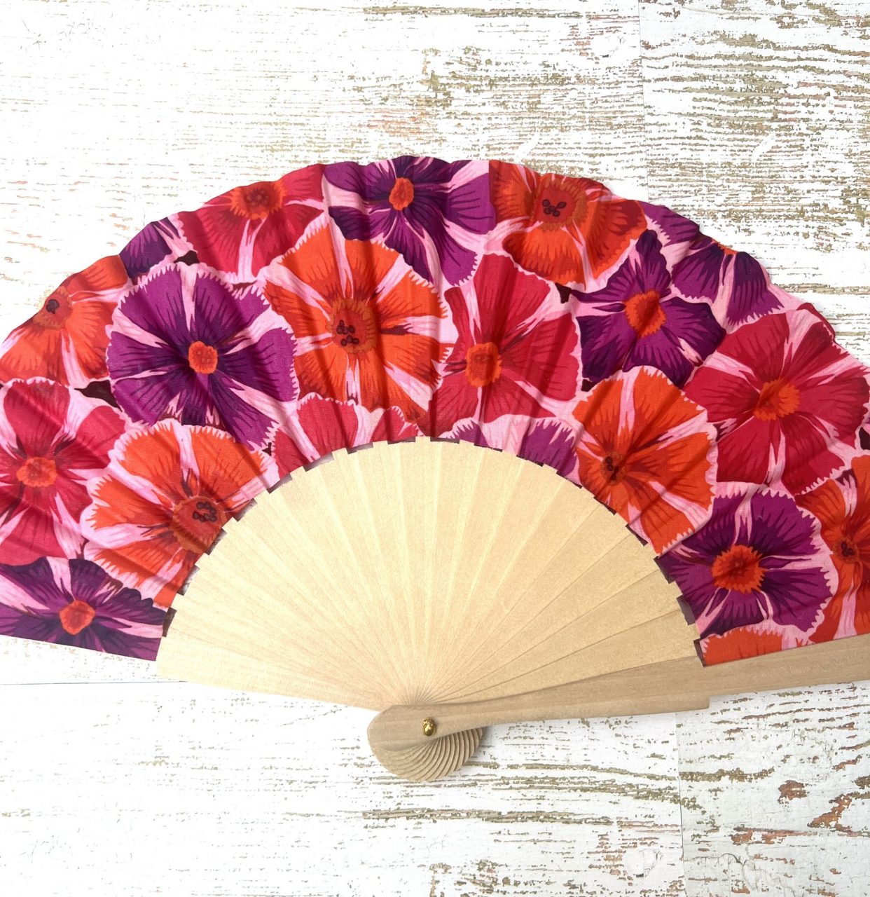 Éventail bois et tissu fleuri orange et violet fabriqué artisanalement dans mon atelier.