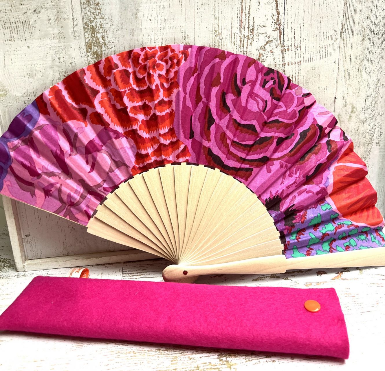 Éventail bois et tissu fuchsia et orange fabriqué artisanalement dans mon atelier.
