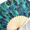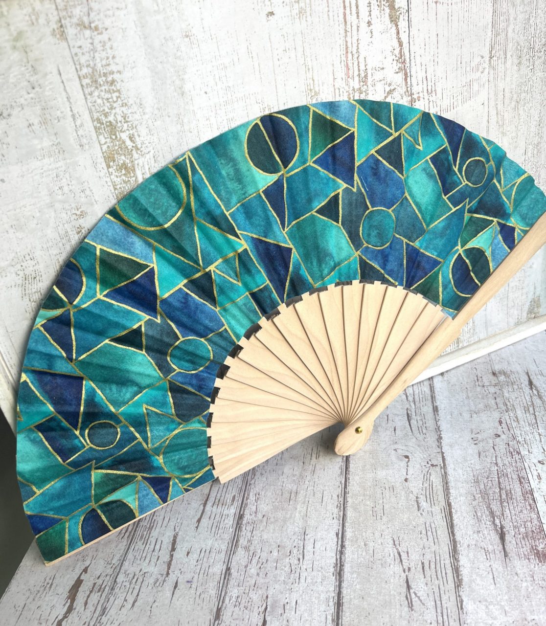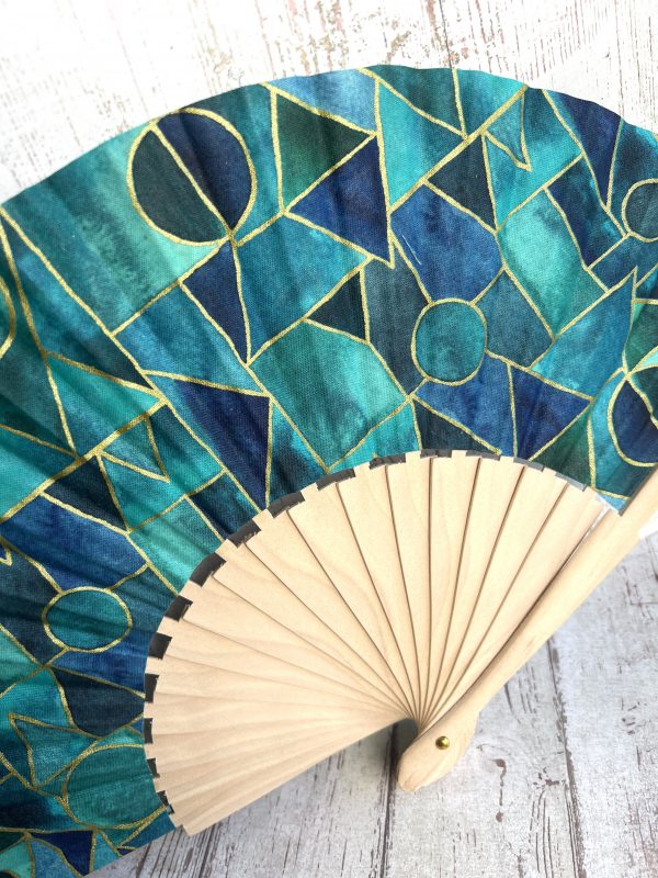Éventail bois et tissu motif mosaïque turquoise. Cet accessoire est fabriqué artisanalement dans mon atelier.